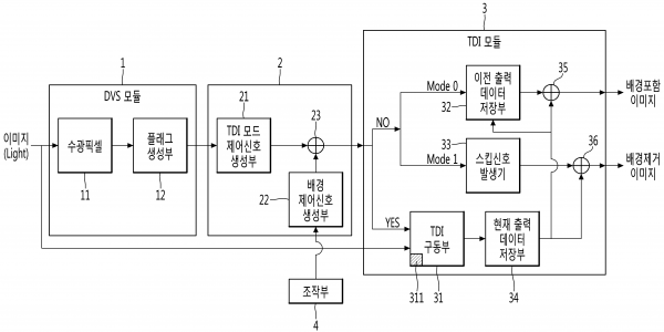 본 발명에 따른 이미지 처리장치에는, 입력되는 빛에 변화가 발생하였을 때 플래그를 발생시키는 DVS 모듈; 상기 플래그에 따라서 다르게 TDI 센서의 제어신호를 생성하는 인터페이스 모듈; 및 상기 TDI 센서의 제어신호에 따라서 TDI 센서의 동작여부가 제어되어, 이미지 정보를 출력하는 TDI 모듈이 포함된다.