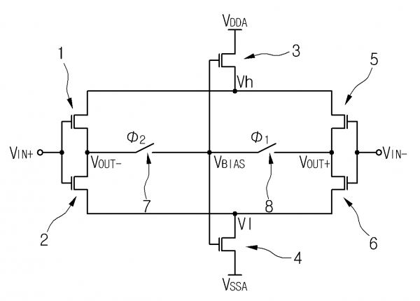 본 발명에 따른 증폭기에는, 직렬로 Vh노드와 Vl노드의 사이에 연결되는 제 1 트랜지스터 및 제 2 트랜지스터; 직렬로 상기 Vh노드와 상기 Vl노드의 사이에 연결되는 제 5 트랜지스터 및 제 6 트랜지스터; 전압원과 상기 Vh노드 사이에 연결되는 제 3 트랜지스터; 그라운드와 상기 Vl노드 사이에 연결되는 제 4 트랜지스터; 상기 제 3 트랜지스터 및 상기 제 4 트랜지스터의 게이트와 상기 제 1 트랜지스터 및 제 2 트랜지스터의 드레인을 스위칭하여, 상기 드레인으로 선택적으로 바이어스를 공급하는 제 1 스위치; 및 상기 제 3 트랜지스터 및 상기 제 4 트랜지스터의 게이트와 상기 제 5 트랜지스터 및 제 6 트랜지스터의 드레인을 스위칭하여, 상기 드레인으로 선택적으로 바이어스를 공급하는 제 2 스위치가 포함된다. 본 발명에 따르면, 전체 장치의 구현 시에, 동일한 성능에도, 크기가 작고, 소비전력이 낮은 장점을 얻을 수 있다. 이미지 센서의 적용 시에는 작은 크기의 픽셀에도 안정적으로 대응할 수 있고, 안정적인 출력신호를 얻을 수 있는 장점이 있다.