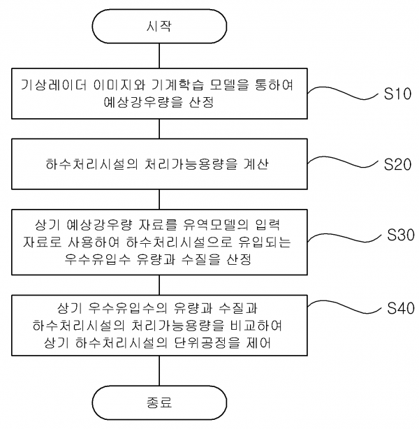 본 발명의 일 실시예에 의한 하수처리시설의 제어방법은 기상레이더 이미지와 기계학습 모델을 통하여 예상강우량을 산정하는 과정, 하수처리시설의 처리가능용량을 계산하는 과정, 상기 예상강우량 자료를 유역모델의 입력 자료로 사용하여 하수처리시설으로 유입되는 우수유입수 유량과 수질을 산정하는 과정 및 상기 우수유입수의 유량과 수질과 하수처리시설의 처리가능용량을 비교하여 상기 하수처리시설의 단위공정을 제어하는 과정을 포함한다.