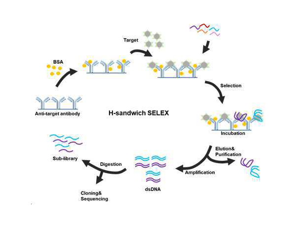 본 발명은 압타머 선별 방법에 관한 것으로서, 본 발명의 선별 방법에 의해 선별된 압타머는 표적 물질에 항체가 결합되는 부분과 다른 부위에 결합되기 때문에, 샌드위치 형태의 바이오센서와 같은 다양한 분야에 적용 가능하며, 별도의 페어링 선별 과정이 필요 없기 때문에 시간이 현저하게 절약된다. 나아가, 이와 같은 압타머는 기존의 항체를 포함하는 제제와 비교하여 안정성 및 민감도가 매우 우수할 뿐만 아니라, 화학적 합성 방법으로 단시간에 적은 비용으로 대량 생산이 가능하고, 결합력을 높이기 위해 다양한 변형이 용이하다는 장점이 존재한다.