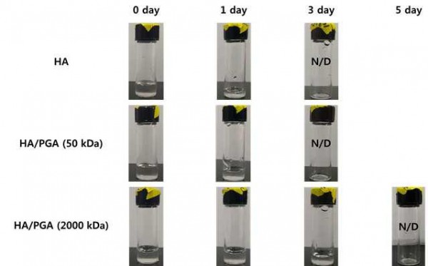 본 발명에서는 친수성 고분자인 폴리(감마-글루탐산)을 수화젤을 이루는 히알루론산 또는 온도 민감성 고분자인 플루로닉과 단순 혼합하여 기존의 수화젤보다 수용액에 더 안정한 수화젤을 형성하였다. 본 발명의 수화젤은 화학적인 가교 반응 없이, 고분자의 물리화학적인 성질에 의해 젤이 형성되므로 수화젤의 준비가 매우 간단하고 생체에 적용하기 용이할 뿐만 아니라 수화젤에 첨가되는 폴리(감마-글루탐산)의 분자량과 수화젤 내의 농도에 따라 수화젤의 안정성을 조절할 수도 있다. 기존의 폴리(감마-글루탐산)이 첨가되지 않은 수화젤의 경우 생체 내의 조직 유착이 쉽게 발생하는 반면, 폴리(감마-글루탐산)이 첨가된 본 발명에 따른 수화젤은 효과적인 조직 유착 방지 현상을 보여 조직 유착 방지제로서 효과가 우수하다.