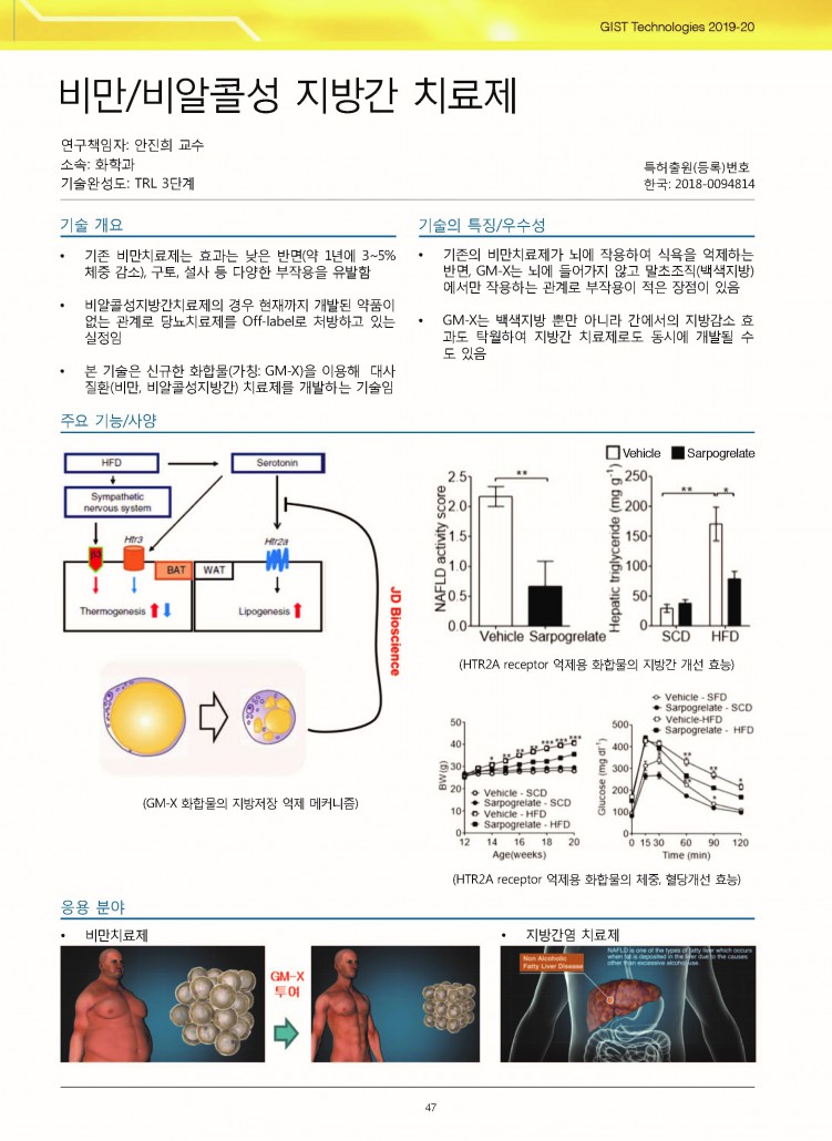 - 본 기술은 신규한 화합물(가칭: GM-X)을 이용해 대사질환(비만, 비알콜성지방간) 치료제를 개발하는 기술임