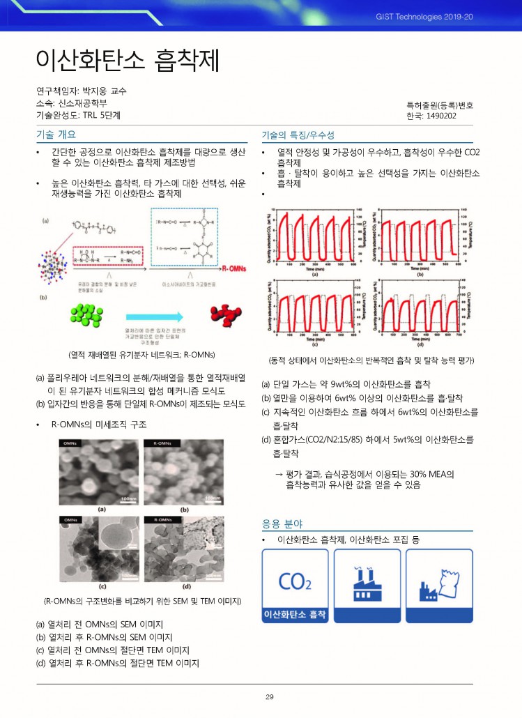 - 높은 이산화탄소 흡착력, 타 가스에 대한 선택성, 쉬운 재생능력을 가진 이산화탄소 흡착제
