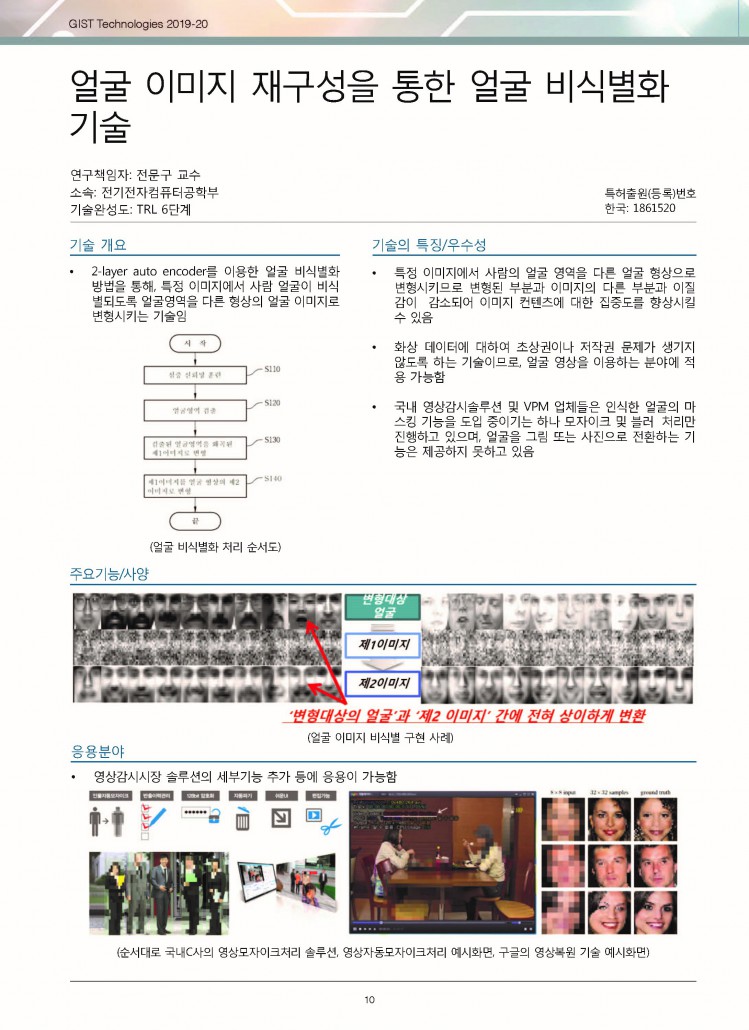2-layer auto encoder를 이용한 얼굴 비식별화 방법을 통해, 특정 이미지에서 사람 얼굴이 비식별되도록 얼굴영역을 다른 형상의 얼굴 이미지로 변경시키는 기술임